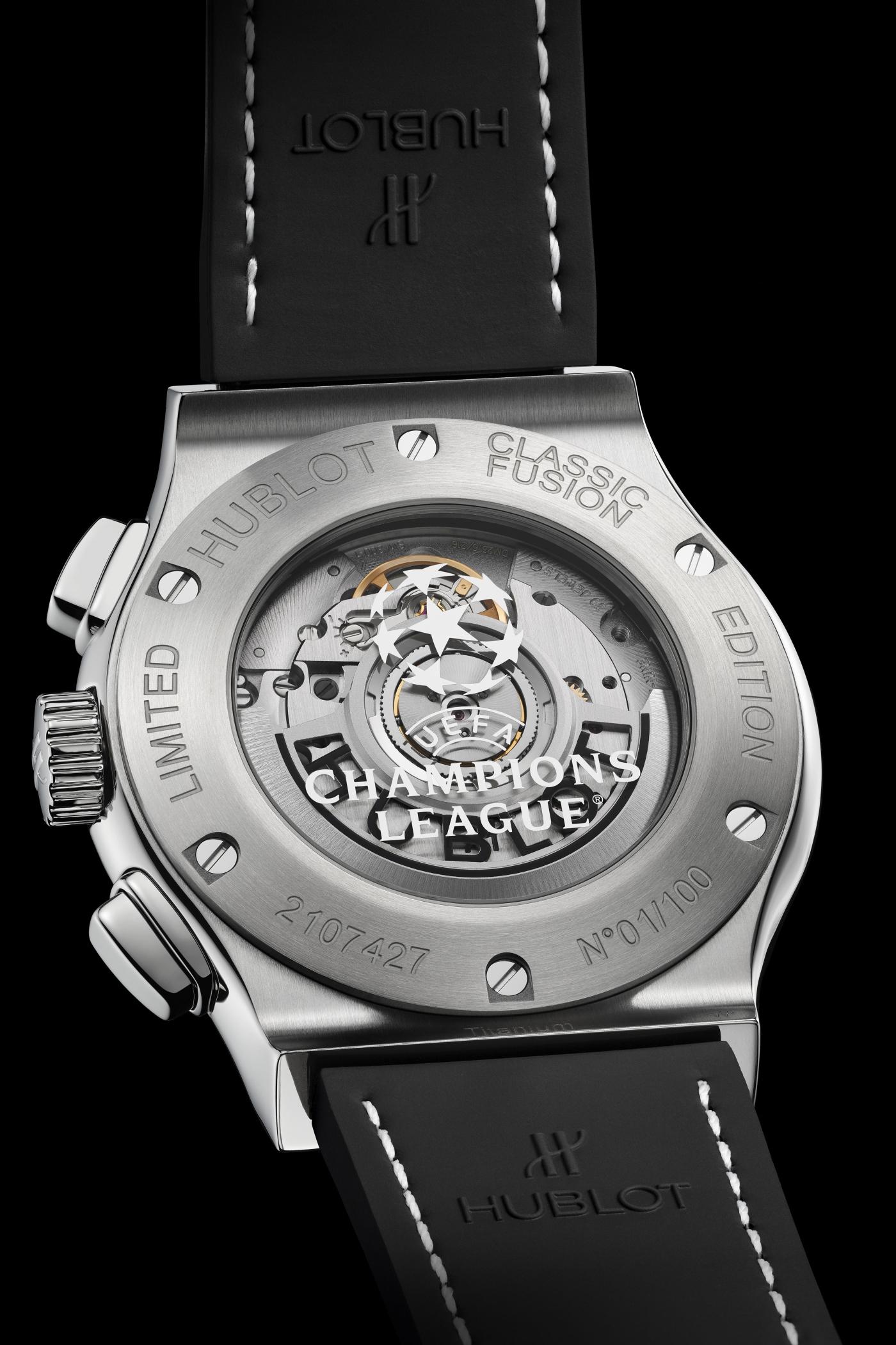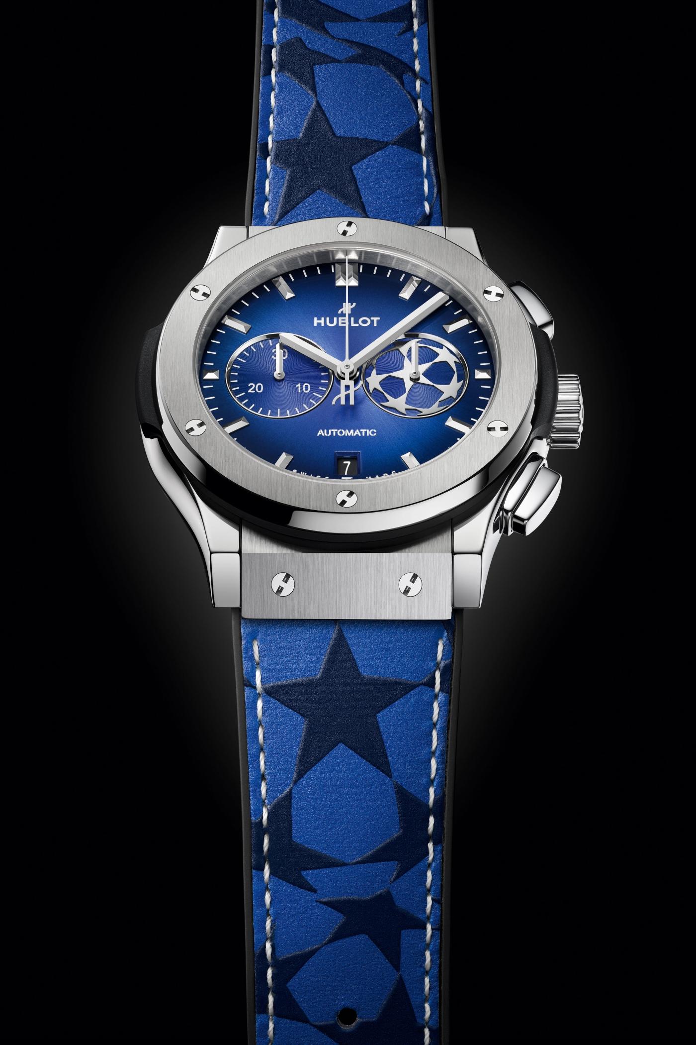 Classic Fusion Chronograph UEFA Champions League Titanium NEW Classic Fusion Chronograph UEFA Champions League Titanium 42MM ... • Suggested retail price ((% country %)(% tax %)) Add or remove this watch from your wishlist Add or remove this watch from your wishlist MAKE AN APPOINTMENT Share Select how you want to share this page. Link to share: An error occurred. Link copied successfully. The Classic Fusion Chronograph UEFA Champions League Titanium is a collector’s item for true football aficionados. This 100-piece limited edition features a 42mm satin-finished and polished titanium case, a gradient blue dial and the UEFA Champions League logo applied on the 3 o’clock counter. The strap fuses black rubber with blue calf leather, proudly bearing the iconic UEFA Champions League starball emblem. Because legends deserve more than a box, each watch is presented in a custom wooden case, complete with an official miniature UEFA Champions League trophy replica: the only one you don’t have to win to lift, but that makes you feel like a winner every time you wear the watch. Read more BEHIND THE SCENES OUR CRAFTSMANSHIP Materials Titanium Titanium is extensively used by Hublot, specifically for its lightness. It displays the best relationship between resistance and weight of any material, which makes it an extremely popular material especially within aeronautics. It also stands out with its resistance to corrosion and its inertia in contact with the skin. Hublot only uses high quality, grade 5 titanium, the strongest there is. Once polished, this material retains a slightly bluish metallic sheen. Learn more Movements Pioneering Watch Movements The Art of Fusion is expressed right through to the heart of the movement. Simple watches with innovative watchmaking concepts, Hublot has created a range of unique “in-house” movements. A unique design of the Unico automatic chronograph. An unparalleled power reserve of Meca-10, Tourbillon and MP-11 calibers. A revolutionary motor approach with 11 MP-05 barrels and 50-day power reserve. In its “Art of Fusion,” Hublot carries out a perfect symbiosis between functionality, architecture and design. Learn more Manufacture under licence by HublotMade in SwitzerlandThe word(s) UEFA, CHAMPIONS LEAGUE, and all other UEFA Champions League marks, names, logos, mascots and trophies are the property, registered trade marks, designs and/or copyright of UEFA. All rights reserved. technical specifications case reference 541.NX.5170.VR.UCL25 Size 42 mm case Satin-finished and Polished Titanium bezel Satin-finished and Polished Titanium water resistance 50m or 5 ATM crystal Sapphire with Anti-reflective Treatment dial Satin-finished Gradient Blue movement movement HUB1153 Self-winding Chronograph Movement power reserve Approx. 48 Hours strap & clasp strap Black Rubber and Blue Calf with UEFA Champions League Logo Printed clasp Stainless Steel Deployant Buckle Clasp KEEP ME UPDATED I want to stay up to date with the latest Hublot news. sign up Classic Fusion Chronograph UEFA Champions League Titanium ... Add or remove this watch from your wishlist ADD TO WISHLIST REMOVE FROM WISHLIST SHARE MAKE AN APPOINTMENT Open Nav Go to the top More in Classic Fusion Classic Fusion Chronograph Titanium Blue 45 mm ... • Suggested retail price ((% country %)(% tax %)) Add or remove this watch from your wishlist Classic Fusion Chronograph Titanium Blue 42 mm ... • Suggested retail price ((% country %)(% tax %)) Add or remove this watch from your wishlist