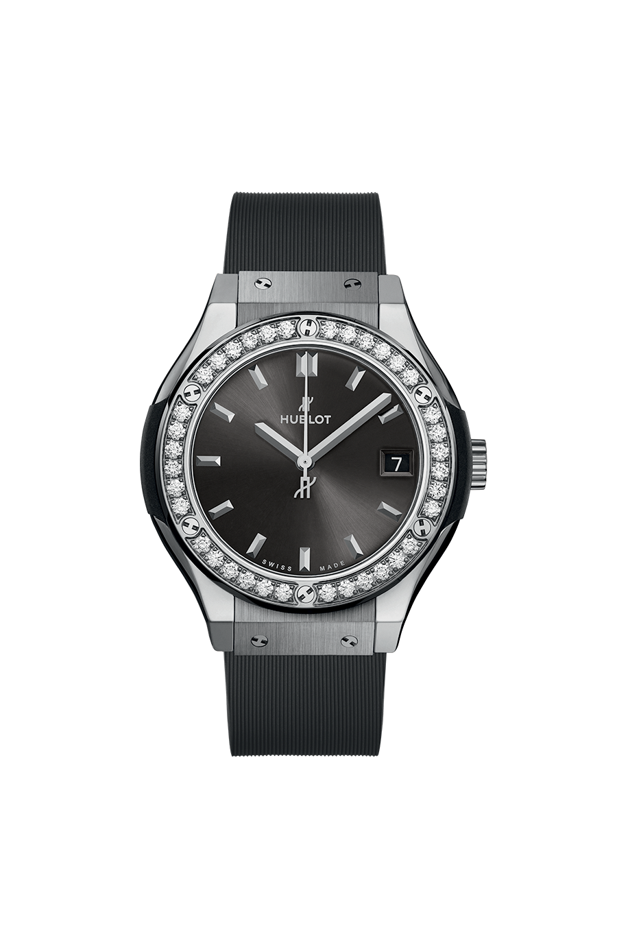 Classic Fusion Racing Grey Titanium Diamonds Classic Fusion Racing Grey Titanium Diamonds 38MM 33MM ... • Suggested retail price ((% country %)(% tax %)) MAKE AN APPOINTMENT Elegance reinvented Share Select how you want to share this page. Link to share: An error occurred. Link copied successfully. BEHIND THE SCENES OUR CRAFTSMANSHIP Movements Pioneering Watch Movements The Art of Fusion is expressed right through to the heart of the movement. Simple watches with innovative watchmaking concepts, Hublot has created a range of unique “in-house” movements. A unique design of the Unico automatic chronograph. An unparalleled power reserve of Meca-10, Tourbillon and MP-11 calibers. A revolutionary motor approach with 11 MP-05 barrels and 50-day power reserve. In its “Art of Fusion,” Hublot carries out a perfect symbiosis between functionality, architecture and design. Learn more Materials Titanium Titanium is extensively used by Hublot, specifically for its lightness. It displays the best relationship between resistance and weight of any material, which makes it an extremely popular material especially within aeronautics. It also stands out with its resistance to corrosion and its inertia in contact with the skin. Hublot only uses high quality, grade 5 titanium, the strongest there is. Once polished, this material retains a slightly bluish metallic sheen. Learn more technical specifications case reference 581.NX.7071.RX.1104 Size 33 mm case Satin-finished and Polished Titanium bezel Polished Titanium Set with 36 Diamonds water resistance 50m or 5 ATM crystal Sapphire with Anti-reflective Treatment dial Satin-finished Gray Sunray movement movement HUB2912 Quartz Movement power reserve 3 to 5 Years strap & clasp strap Gray Lined Rubber Straps clasp Stainless Steel Deployant Buckle Clasp DESIGN FIND THE PERFECT STRAP FOR YOUR HUBLOT Use our custom strap configurator EXPLORE More in 3-Hands Classic Fusion Black Magic 38 mm ... • Suggested retail price ((% country %)(% tax %)) Classic Fusion Black Magic 42 mm ... • Suggested retail price ((% country %)(% tax %)) Classic Fusion Black Magic 45 mm ... • Suggested retail price ((% country %)(% tax %)) Classic Fusion Ceramic Blue 38 mm ... • Suggested retail price ((% country %)(% tax %)) Classic Fusion Ceramic Blue 42 mm ... • Suggested retail price ((% country %)(% tax %)) Classic Fusion Ceramic Blue 45 mm ... • Suggested retail price ((% country %)(% tax %)) Classic Fusion Ceramic King Gold 38 mm ... • Suggested retail price ((% country %)(% tax %)) Classic Fusion Ceramic King Gold 42 mm ... • Suggested retail price ((% country %)(% tax %)) Classic Fusion Ceramic King Gold 45 mm ... • Suggested retail price ((% country %)(% tax %)) Classic Fusion King Gold 33 mm ... • Suggested retail price ((% country %)(% tax %)) KEEP ME UPDATED I want to stay up to date with the latest Hublot news. sign up Classic Fusion Racing Grey Titanium Diamonds ... ADD TO WISHLIST REMOVE FROM WISHLIST SHARE MAKE AN APPOINTMENT Open Nav Go to the top