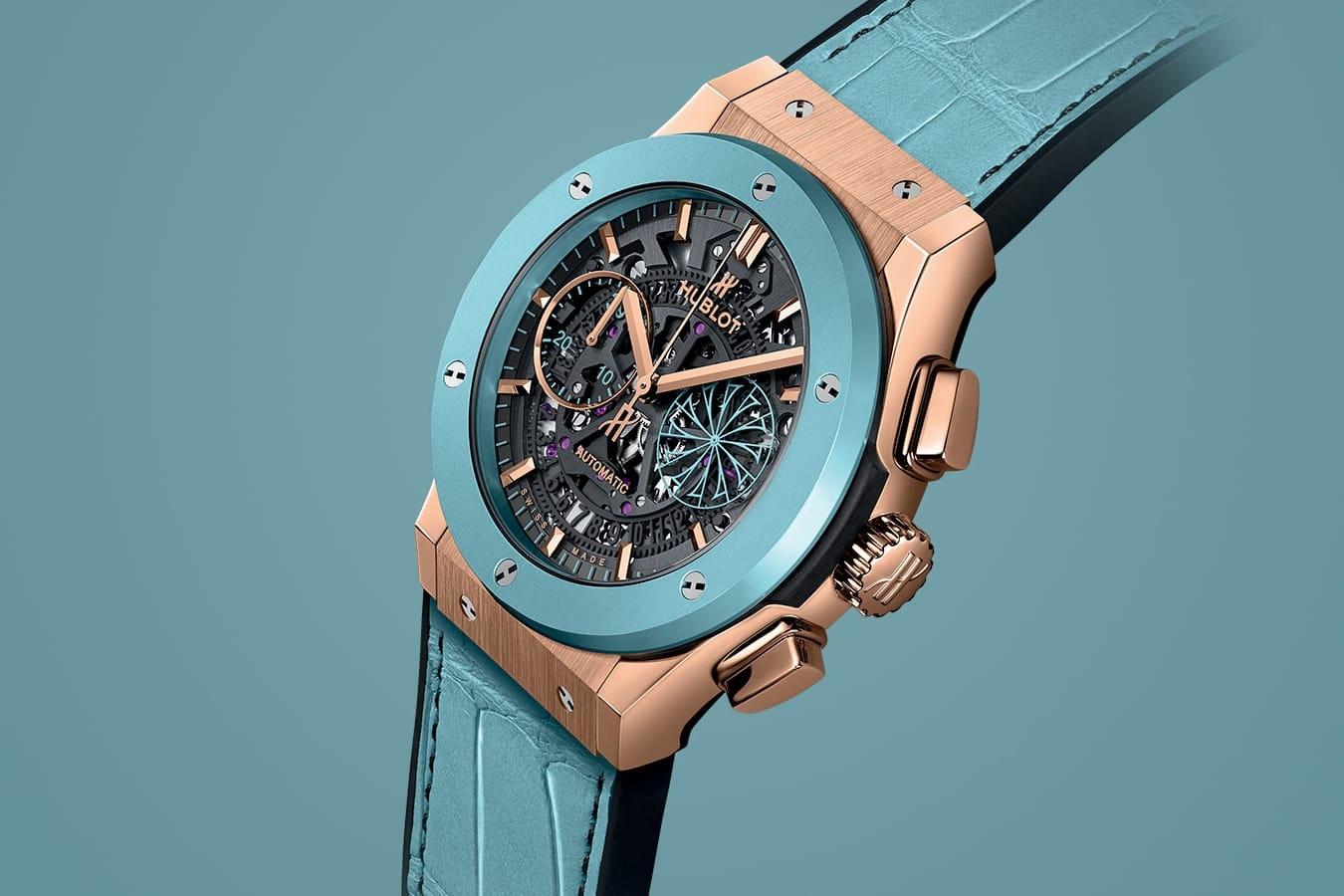 To celebrate summer, Hublot is dedicating its Classic Fusion Chronograph Mykonos Model to the island and its iconic symbol: the discreet and elegant rotating windmill. Crowned with sky blue ceramic bezel, the 45-mm case encloses a skeleton self-winding chronograph movement, held on a bi-material strap in black rubber and sky blue alligator leather. The sapphire dial showcases the Hublot logo engraved at the crown in either polished king gold or titanium.